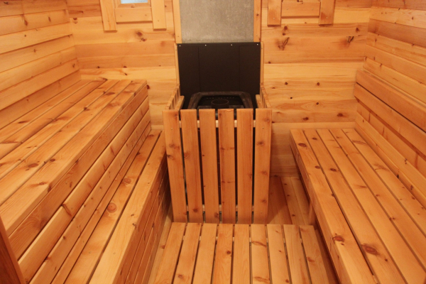 Забор из кедра вокруг печи, это в первую очередь безопасность от случайных ожогов, а также красивый эстетический вид.