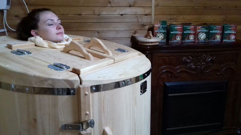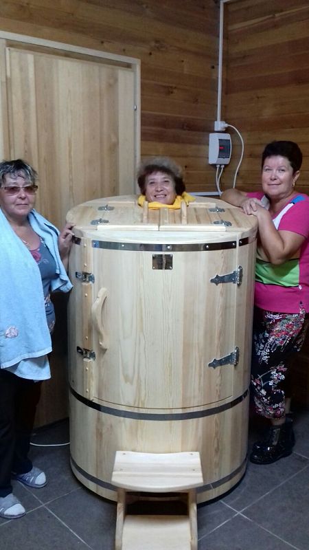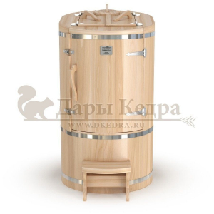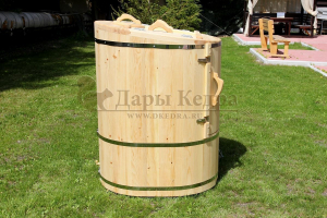 Готовый комплект - это полностью укомплектованный набор с фитобочкой для процедур парения. Овальная модель более просторна и удобна в использовании. Толщина стенок составляет 40-45 мм, что позволяет увеличить срок службы изделия. Верхний скос делает положение головы более комфортным и улучшает обзор. Фитобочка оборудована откидными створками, дверцей и отверстием для головы. Во время парения человек сидит внутри кедровой бочки, а голова находится снаружи. Благодаря этому исключается возможность перегрева. Подлокотники из кедра, встроенные ручки на створках и двери делают эксплуатацию более удобной.