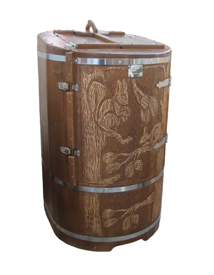 Кедровая бочка (фитобочка) «Звери в лесу» Любая модель эксклюзивной фитобочки - это выбор не только дизайнеров и ценителей красоты, но и тех, кто любит нестандартный подход в любых деталях. С оригинальной авторской фитобочкой Дары Кедра ваша квартира, дом или салон красоты станут объектом всеобщего внимания, ведь такая фитобочка - это не просто смело, красиво и достойно, это еще и очень полезно для Вашего здоровья! Художественная резьба это ручная работа, выполняется разными мастерами и каждый рисунок неповторим. Вы можете выбрать предложенные варианты резьбы или подобрать изображение и мы предложим вам подходящий эскиз. На сайте представлены наши работы в качестве примера. Каждая резьба рассчитывается индивидуально и может быть нанесена на любую модель фитобочки. Эксклюзивная фитобочка может быть представлена в разной цветовой гамме: После того, как цвет фитобочки выбран, необходимо определиться с вариантом резьбы (или предложить свой): Фитобочку можно также декорировать канатной веревкой в места обручей из нержавеющей стали (оплачивается дополнительно).