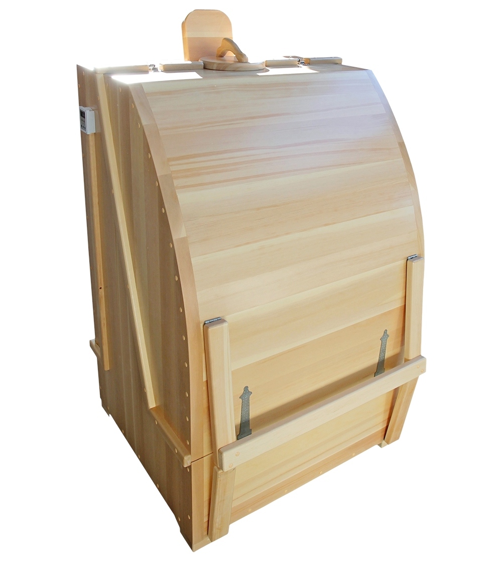 Кедровая бочка (фитобочка) круглая «Профессиональная Богатырская» Это круглая фитобочка из кедра увеличенных размеров с толщиной стенок 45 мм. Подходит для людей высокого роста и крупной комплекции. Фитобочка оборудована откидными створками, дверцей и отверстием для головы. Во время парения человек сидит внутри кедровой бочки, а голова находится снаружи. Благодаря этому исключается возможность перегрева. Подлокотники из кедра, встроенные ручки на створках и двери делают эксплуатацию более удобной. Парение в фитобочке благотворно влияет на организм в целом: повышается иммунитет, выводятся шлаки и токсины, улучшается работа органов тела и состояние кожи.