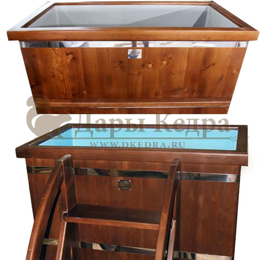 Особенность этой модели заключается в сборке купели по технологии лунный-паз. Паз (углубление) одной доски прочно соединяется с выемкой следующей. Такая сборка осуществляется без клея и гвоздей. Готовая конструкция прочно фиксируется нержавеющими обручами. Пластиковая вставка придает изделию красивый внешний вид, увеличивает срок службы и облегчает уход за купелью. Для удобства пользования купель оснащена лавочками, приставной и внутренней лестницей из кедра. Подходит для комнатного и уличного использования.